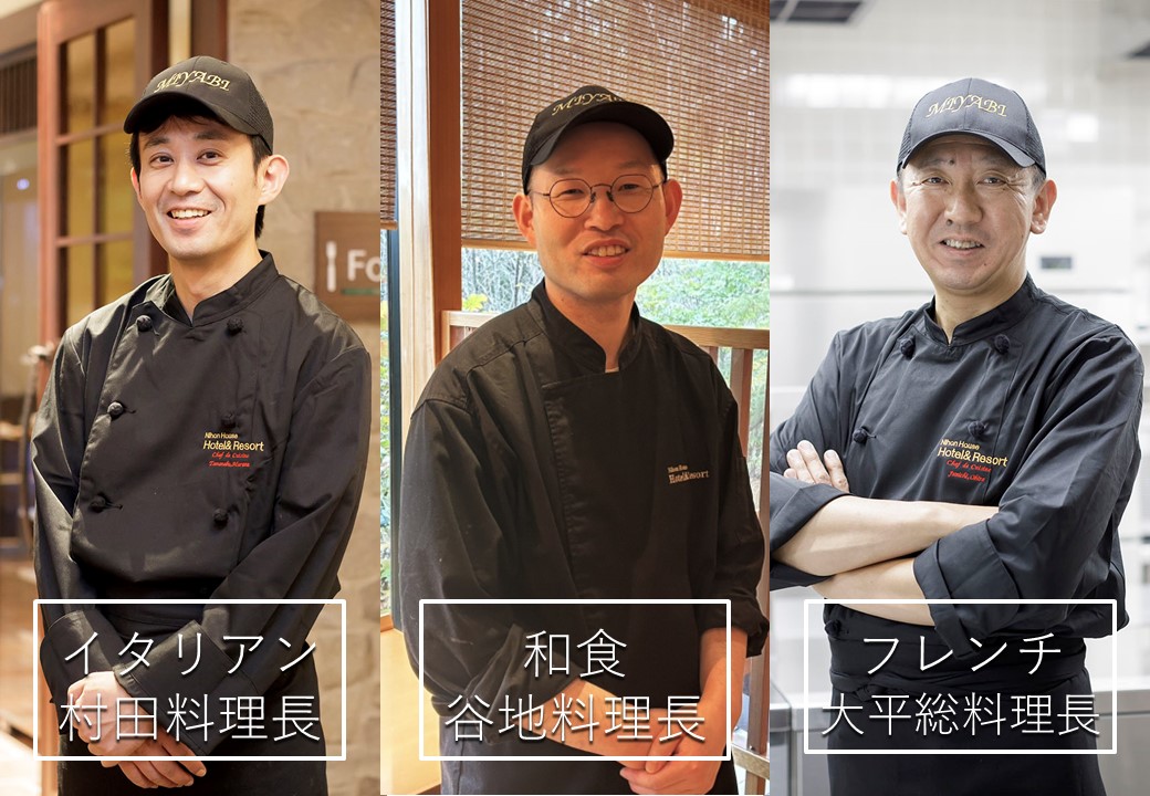森の風那須には「創作イタリアン」と「創作会席」、四季の館那須には「会席フレンチ」の3つのお料理をご堪能する事ができます。